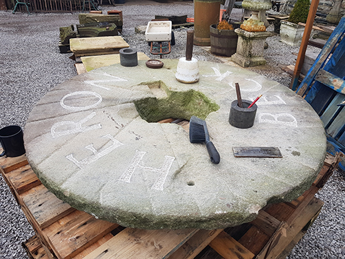 Lintle in sandstone, larger cut letters around £35 a letter. This complete lintle around £690